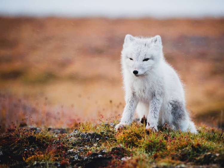 Arctic fox seen on the permafrost of the New Siberian Islands, a port visited on an all-inclusive, luxury expedition Seabourn cruise.