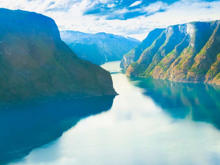 Threading between the many small islands scattered across its entrance, your ship enters the King of Fjords. Winding 127 miles/205 km deep into the mountainous countryside, it is the largest and deepest of Norway’s fjords. After crossing a narrow sill of shallow water (330 ft/100 m) the bottom plunges to an average depth ten times as great. Its deepest point is 4,231 feet/1308 m below sea level, although a layer of silt blankets the fjord bottom to a depth of 660 feet/200m. The glacier-carved cliffs on either side rise another 3,300 ft/1000m, and at its furthest end, the fjord carves into a range of 6,600-ft/2000m peaks cradling the Jostedalsbreen, Europe’s largest glacier. Its average width is 2.8 miles/4.5 km. Waterfalls tinsel down the steep walls at intervals, sparkling in the endless summer sun. Here and there, a plucky little farm clings perilously to a narrow shelf either beside the water or unbelievably perched partway up the wall, looking like child’s toy against the scale of the peaks. It is a scene that brings to mind the sonorous call of a lur – the wooden horns sounded by Vikings in these majestic fjords.