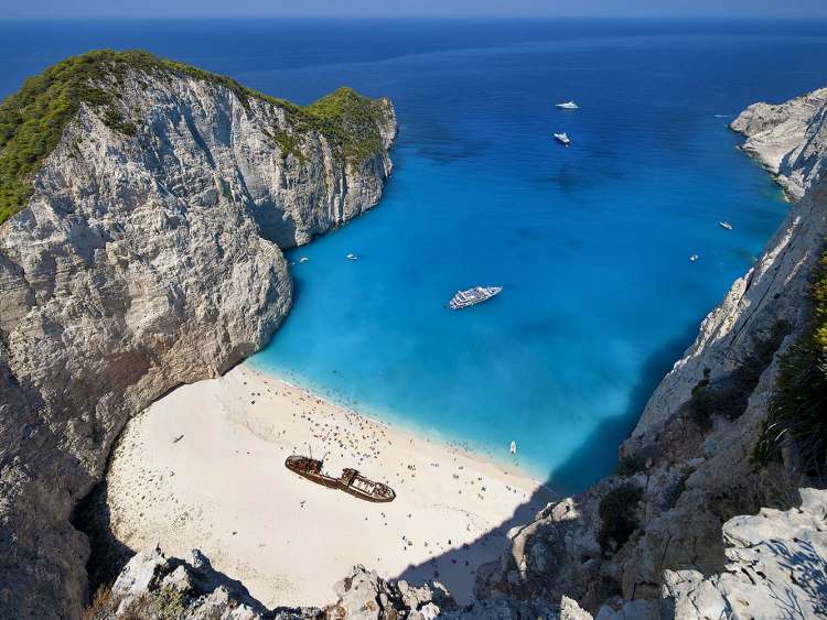 The third largest of the Ionian Isles, Zakinthos is most famous for its isolated “Shipwreck Beach,” accessible only by boat. The shining white pebble beach ignites the turquoise color of the sea, as it does in the numerous small caves around Cape Skinari, again only seen from a small boat. Between Skinari and the mountain village of Keri are fantastic rock arches and other bizarre formations. The town is curved around a large harbor, and guarded by an old Venetian castle with panoramic views of the town and harbor.