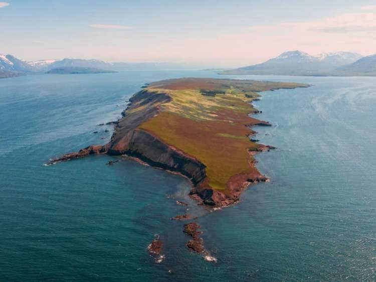 Aerial view of the Icelandic island, Hrisey, a port visited on an all-inclusive, luxury Seabourn cruise.