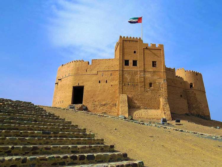 Khor al Fakkan is a busy deep-water seaport on the Gulf of Oman. The town is located in the Sharjah, among the most conservative of the emirates, so there is no alcohol served anywhere here, and both clothing and beach attire should be modest. The eastern coast of the Arabian Peninsula is mountainous and make a cooler escape for emiratis suffering from the heat of Dubai and Abu Dhabi. In nearby Fujairah, the oldest mosque in the Emirates is a 15th century mud and brick structure, glowing white, with four domes overshadowed by a picturesque ruined fortress nearby. Fujairah also has a Heritage Village reflecting the traditional lifestyle of the region. The rugged peaks of the Hajar range are corrugated by deep wadis such as Wadi Wurayah, some of which hide fresh green oases, such as the one at Wadi Shawka, tucked between their steep walls. Wadi Wurayah even has a waterfall.