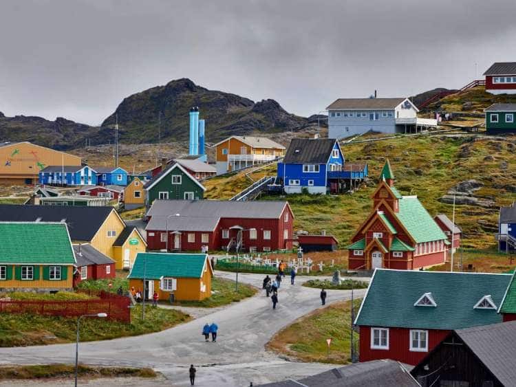 The small town of Paamuit and its 1,600 inhabitants are off the beaten track of Greenlandic tourism. This is remote Greenland at its best. As you walk through town it isn’t unusual to find seal meat and seal skins drying on racks under houses. People have lived here since 1,500 B.C.E. After the arrival of the Danes in 1742, the community prospered by trading furs and whale products and became known for its soapstone carvings. Today, the sea remains ice-free during the winter, providing inhabitants with year-round fishing. The town itself is a multitude of brightly colored buildings. Fredens Kirke is a simple but elegant Lutheran church located in the center of town. The unadorned white crosses of the adjacent graveyard contrast the green roof, red walls and golden trim of the church.
